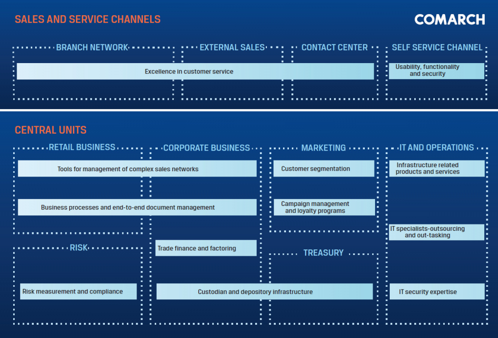 This diagram presents Comarch’s competencies in the banking sector: