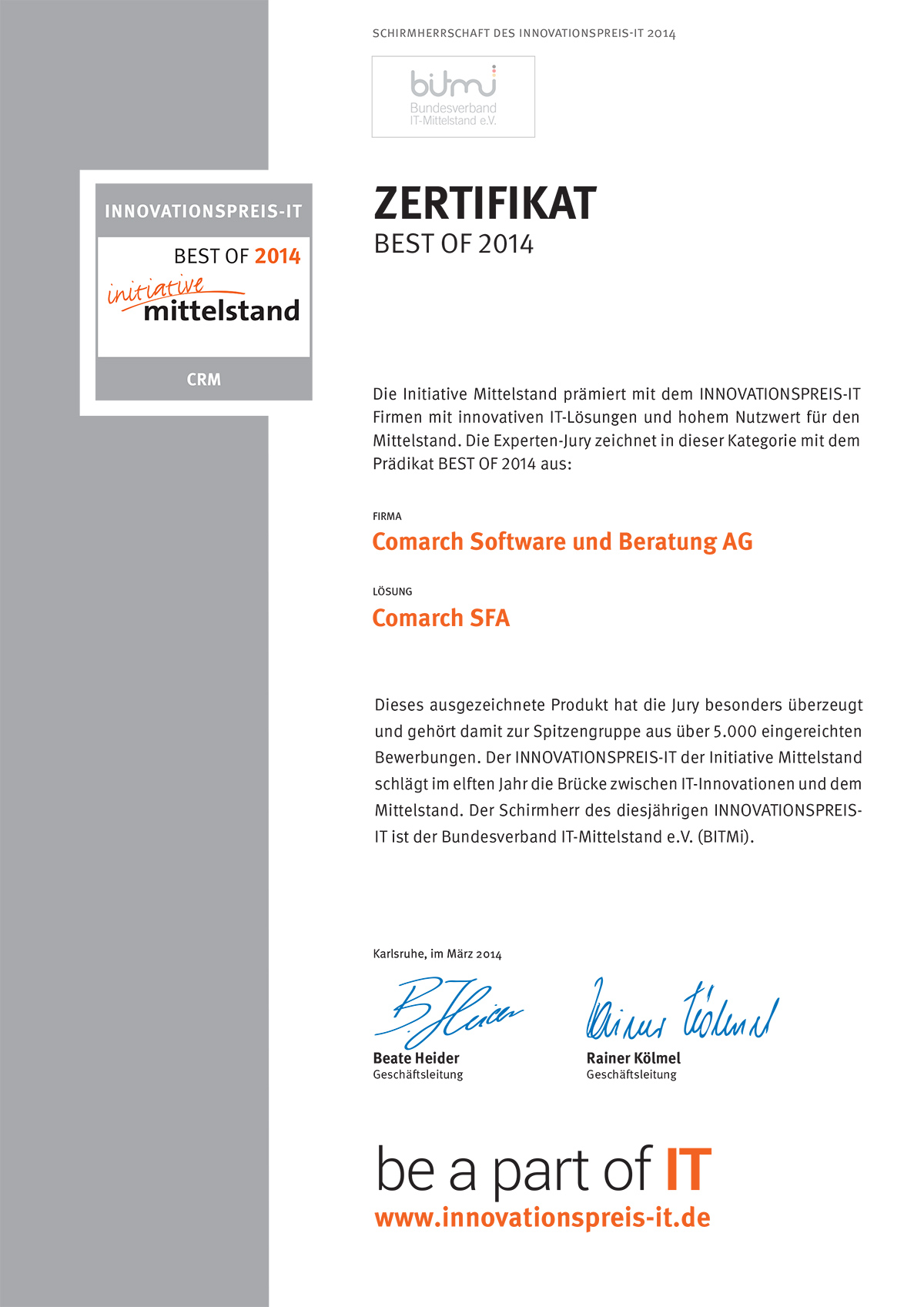 Comarch SFA solution to support sales processes received the award for the most innovative solutions in its class and received an award INNOVATIONSPREIS-IT 2014.